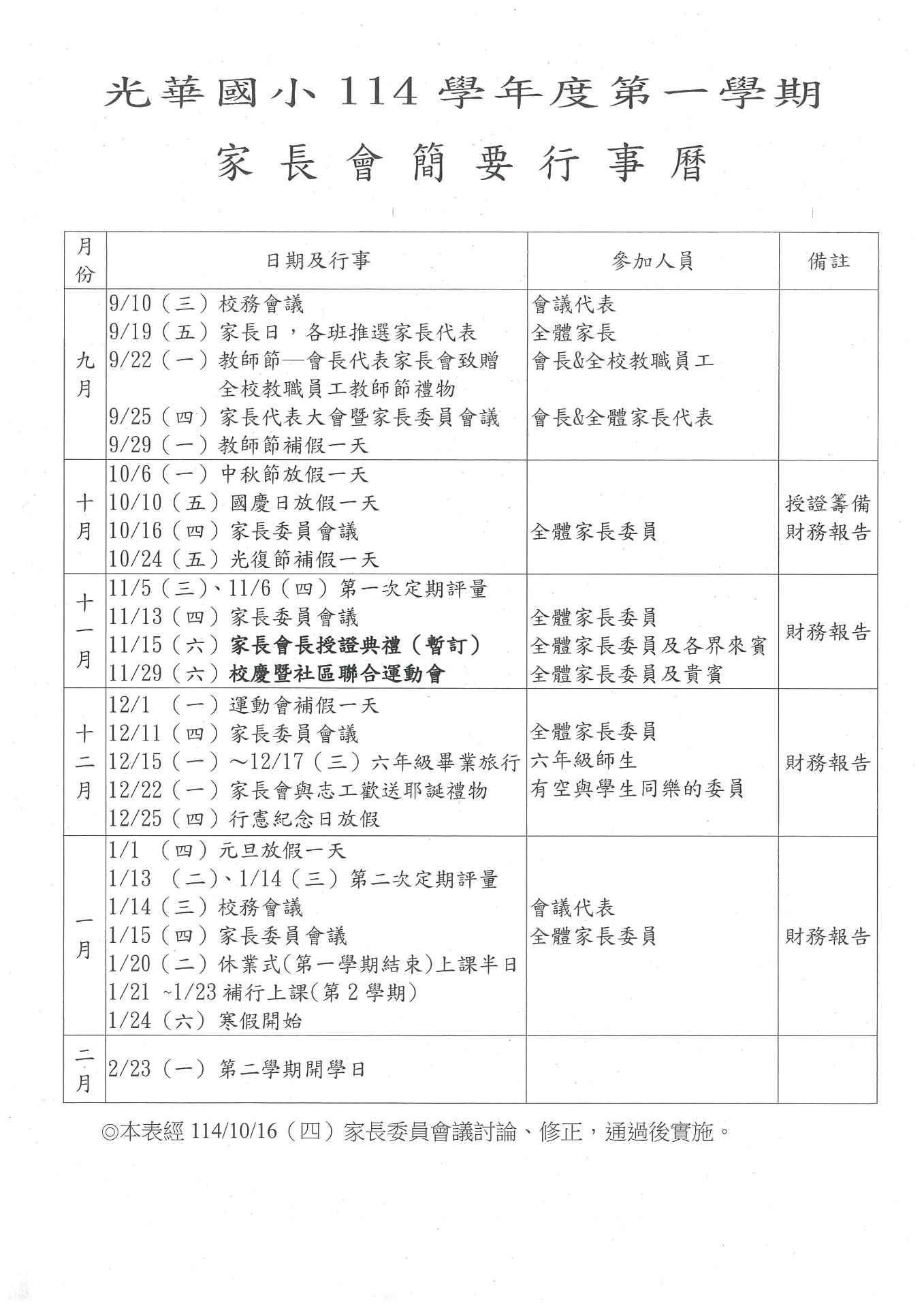 家 長 會 簡 要 行 事 曆114/10/16委員會議通過